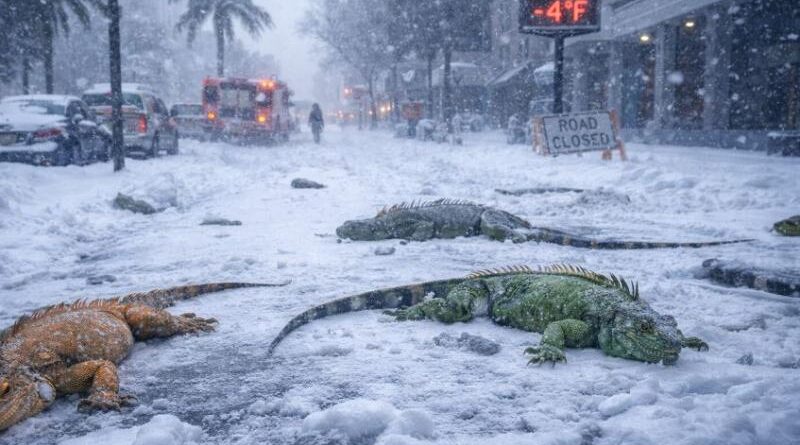 फ्लोरिडा के ऑरलैंडो में न्यूनतम तापमान माइनस 4 डिग्री सेल्सियस दर्ज किया गया, जो फरवरी महीने में साल 1923 के बाद का सबसे कम तापमान है। 100 साल बाद आई इस रिकॉर्ड ठंड ने मौसम वैज्ञानिकों को भी हैरान कर दिया है। सामान्यतः यहाँ इन दिनों तापमान 12 से 23 डिग्री के बीच रहता है। ठंड के कारण ठंडे खून वाले जीव इगुआना के शरीर ने काम करना बंद कर दिया और वे सड़कों व फुटपाथों पर बेसुध पड़े नजर आए। प्रशासन ने वन्यजीवों की सुरक्षा के लिए इमरजेंसी आदेश जारी किए हैं, जिसके तहत नागरिकों को इन जीवों को सुरक्षित स्थानों या सरकारी दफ्तरों तक पहुंचाने की छूट दी गई है। बचाव कार्य में जुटी जेसिका किलगोर के मुताबिक, ठंड की तीव्रता इतनी अधिक थी कि सड़कों से सैकड़ों किलो इगुआना इकट्ठा किए गए, जिनमें से कई की मौत हो चुकी थी।