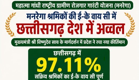 रायपुर, 27 अप्रैल 2026/ महात्मा गांधी राष्ट्रीय ग्रामीण रोजगार गारंटी योजना (मनरेगा) के अंतर्गत श्रमिकों के ई-के वाय सी कार्य में छत्तीसगढ़ ने पूरे देश में प्रथम स्थान प्राप्त कर उल्लेखनीय उपलब्धि हासिल की है। भारत सरकार द्वारा जारी ताजा रिपोर्ट के अनुसार प्रदेश में 97.11 प्रतिशत सक्रिय श्रमिकों का ई-के वाय सी पूर्ण कर लिया गया है, जो राष्ट्रीय स्तर पर सर्वाधिक है। खास बात यह है कि छत्तीसगढ़ ने केरलम, त्रिपुरा, मिजोरम जैसे छोटे राज्यों तथा कर्नाटक, तमिलनाडु जैसे बड़े राज्यों को भी पछाड़कर यह उपलब्धि हासिल की है।