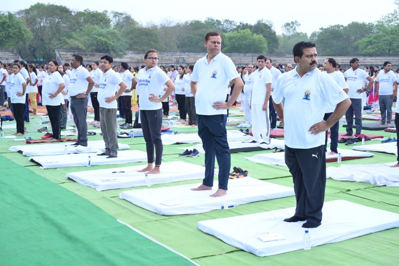 अंतर्राष्ट्रीय योग दिवस के अवसर पर आज रविशंकर स्टेडियम दुर्ग में आयोजित दशम योगाभ्यास कार्यक्रम में प्रदेश के उपमुख्यमंत्री श्री विजय शर्मा शामिल हुए। मुख्य अतिथि श्री शर्मा के साथ विधायक श्री गजेन्द्र यादव भी योगाभ्यास में शामिल हुए। पतंजलि योगपीठ के श्री जयंत भारती और श्री पंकज शर्मा के मार्गदर्शन में मुख्य अतिथि श्री शर्मा, विधायक श्री यादव, संभागायुक्त श्री सत्यनारायण राठौर, आईजी श्री आर.जी. गर्ग, कलेक्टर सुश्री ऋचा प्रकाश चौधरी, एसपी श्री जितेन्द्र शुक्ला, नगर के गणमान्य नागरिक, समस्त विभाग के अधिकारीगण, नगर के विभिन्न विद्यालयों के विद्यार्थी ने योग के विभिन्न मुद्राओं का अभ्यास किये।