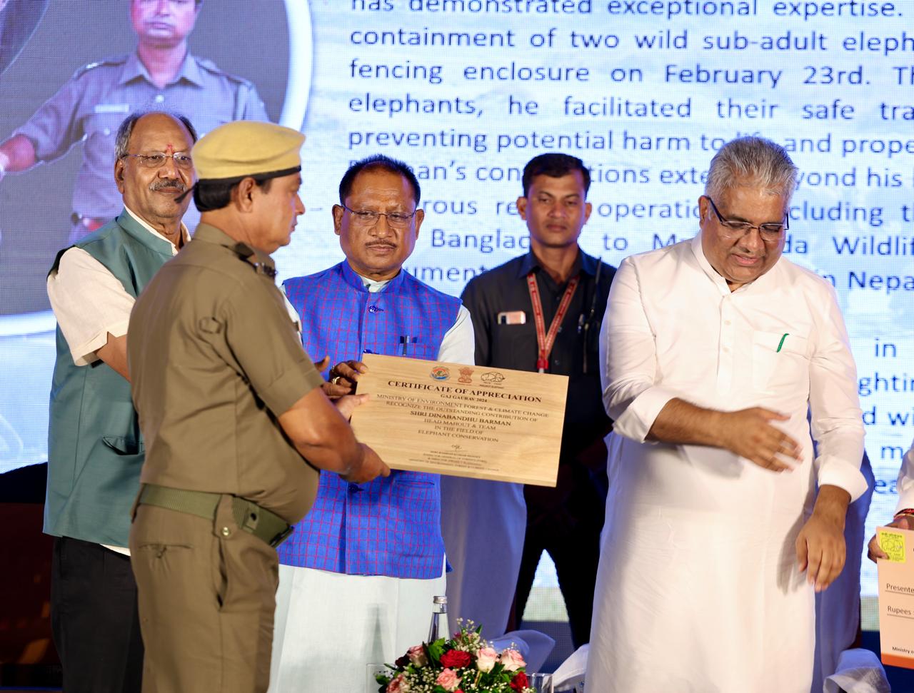 केन्द्रीय मंत्री श्री यादव और मुख्यमंत्री श्री साय ने हाथी संरक्षण एवं प्रबंधन के क्षेत्र में अनुकरणीय योगदान के लिए विजेताओं को गज गौरव पुरस्कार प्रदान किये। इस कार्यक्रम के दौरान, प्रतिष्ठित गज गौरव पुरस्कार (1) स्वर्गीय श्री बुबुल गोगोई, (मरणोपरांत) महावत, असम (2) श्री दीनबंधु बर्मन, प्रमुख महावत एवं टीम, पश्चिम बंगाल (3) श्री अनय कुमार सामल, पैरा वन कार्यकर्ता, ओडिशा और (4) श्रीमती संघमित्रा महंत, वन रक्षक, ओडिशा को उनकी अनुकरणीय सेवाओं के लिए प्रदान किए गए है।