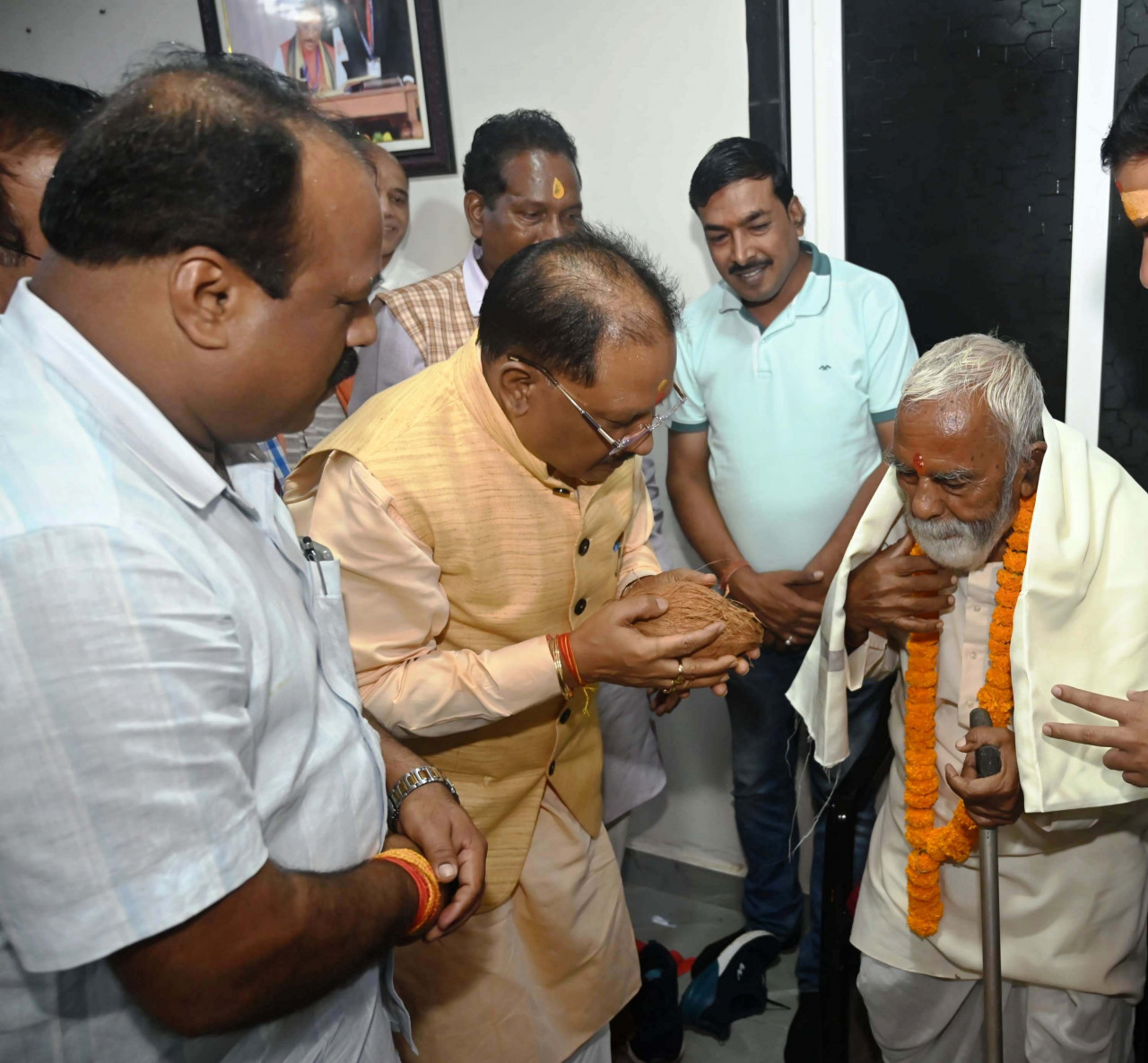 रायपुर : मुख्यमंत्री विष्णुदेव साय अपने बचपन के स्कूली शिक्षक श्री राजेश्वर पाठक से मुलाकात कर भाव विभोर हो गए। उन्होंने अपने स्कूल के दिनों को याद किया और अपने शिक्षक का चरण स्पर्श कर अभिवादन किया। मुख्यमंत्री ने उन्हें शाल एवं श्रीफल भेंट कर सम्मानित भी किया। मुख्यमंत्री ने कहा कि गुरूजनों का ही आशीर्वाद है कि मैं यहां तक पहुंच पाया हूँ ऐसा कहते हुए उन्होंने अपने शिक्षक से फिर से आशीर्वाद मांगा और उनके शिक्षक ने भी पूरे दिल से आशीर्वाद दिया।