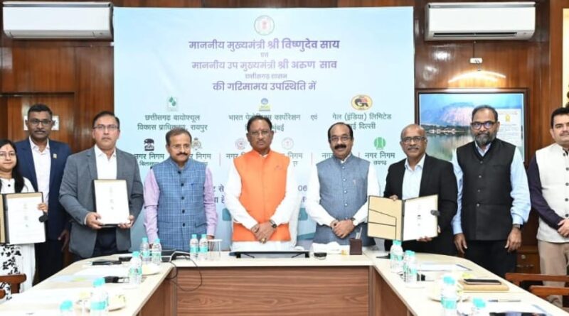 ***मुख्यमंत्री की मौजूदगी में नगरीय ठोस अपशिष्ट से कंप्रेस्ड बायोगैस उत्पादन के लिए हुआ एमओयू**छत्तीसगढ़ ने स्वच्छ पर्यावरण और नेट जीरो एमिशन के लक्ष्य को पाने की दिशा में की बड़ी पहल**छत्तीसगढ़ बायोफ्यूल विकास प्राधिकरण, गेल इंडिया लिमिटेड, भारत पेट्रोलियम और प्रदेश के 6 नगर निगमों के बीच समझौता**350 मीट्रिक टन नगरीय ठोस अपशिष्ट एवं 500 मीट्रिक टन अधिशेष बायोमास से बनेगा जैव ईंधन**06 संयंत्रों से प्रतिदिन लगभग 70 मीट्रिक टन कंप्रेस्ड बायोगैस का होगा उत्पादन*रायपुर 17 जनवरी 2025// छत्तीसगढ़ ने स्वच्छ पर्यावरण और नेट जीरो एमिशन के लक्ष्य को पाने की दिशा में बड़ी पहल की है। मुख्यमंत्री श्री विष्णु देव साय ने आज मुख्यमंत्री निवास कार्यालय में नगरीय ठोस अपशिष्ट से कंप्रेस्ड बायोगैस उत्पादन के लिए छत्तीसगढ़ बायोफ्यूल विकास प्राधिकरण, गेल इंडिया लिमिटेड, भारत पेट्रोलियम और प्रदेश के 6 नगर निगमों के बीच ऐतिहासिक त्रिपक्षीय एमओयू संपन्न होने के अवसर पर यह बात कही। मुख्यमंत्री ने सभी संस्थाओं को इस विशेष एमओयू के लिए शुभकामनाएं दी और कहा कि यह कदम स्वच्छता, ऊर्जा उत्पादन और सतत विकास के क्षेत्र में छत्तीसगढ़ को एक नई पहचान दिलाएगी। मुख्यमंत्री ने कहा कि छत्तीसगढ़ के विकास में आज एक और महत्वपूर्ण कड़ी जुड़ रही है। छत्तीसगढ़ में सतत योजना के अंतर्गत नगरीय ठोस अपशिष्ट से कम्प्रेस्ड बायोगैस उत्पादन की दिशा में हम तेजी से आगे बढ़ रहे है। प्रधानमंत्री श्री नरेंद्र मोदी ने स्वच्छ भारत मिशन की शुरुआत की थी और इसी पहल के माध्यम से देशवासियों में अपने परिवेश की स्वच्छता को लेकर व्यापक चेतना आई थी। उन्होंने कहा कि अब प्रदेश में स्वच्छता को लेकर बेहतर काम हो रहे हैं। नगरीय निकायों में इन संयंत्रो की स्थापना से शहरों को स्वच्छ-सुंदर बनाने का हमारा संकल्प पूरा होगा। जैव ईंधन के रूप में बायोगैस के उत्पादन से हमारी ऊर्जा की आवश्यकता भी पूरी होगी और वेस्ट टू एनर्जी की परिकल्पना भी साकार होगी। उन्होंने एमओयू में शामिल सभी संस्थाओं से संयंत्र की स्थापना के कार्य को समयबद्ध रूप से पूर्ण करने का करने को कहा। मुख्यमंत्री श्री साय ने कहा कि इस एमओयू से पर्यावरण संरक्षण और स्वच्छता जैसे बड़े उद्देश्य की पूर्ति के साथ-साथ रोजगार भी सृजित होंगे। भारत सरकार के प्रतिष्ठित संस्थाओं के सहयोग से यह कार्य पूरा होगा और इस क्षेत्र में उनकी विशेषज्ञता का लाभ भी हमें मिलेगा। उप मुख्यमंत्री श्री अरूण साव ने कहा कि प्रधानमंत्री श्री नरेंद्र मोदी के नेतृत्व में पर्यावरण संरक्षण, स्वच्छता और वेस्ट टू वेल्थ की दिशा में बड़े निर्णय लिए गए हैं। प्रदेश में स्वच्छता को लेकर लगातार अभियान चलाया जा रहा है और शहरों के ल